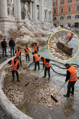 Щопонеділка зранку біля фонтану Треві відбувається тиха, але добре організована операція. Під наглядом поліції воду тимчасово перекривають, працівники спускаються у чашу зі спеціальним обладнанням і за допомогою насосів та довгих інструментів обережно збирають монети, щоб не пошкодити мармур.