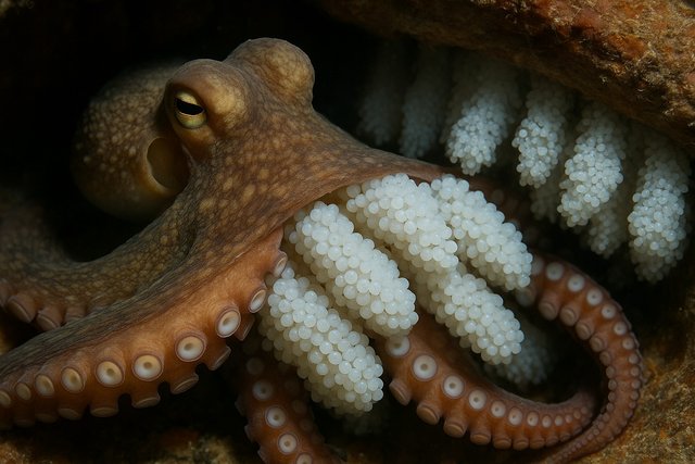 Коли мама-восьминіг відкладає яйця, вона не залишає їх ні на мить.